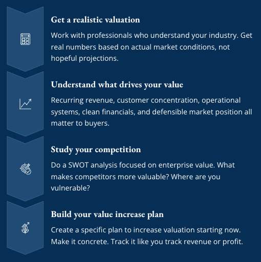 Get a realistic valuation. Work with professionals who understand your industry. Get real numbers based on actual market conditions, not back-of-napkin calculations or hopeful projections.